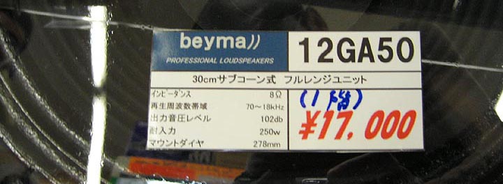 beymaの12GA50の値札。外見、口径、能率、耐入力からして、PA用ユニット向けなのだろう。値段はPS300と同じ。