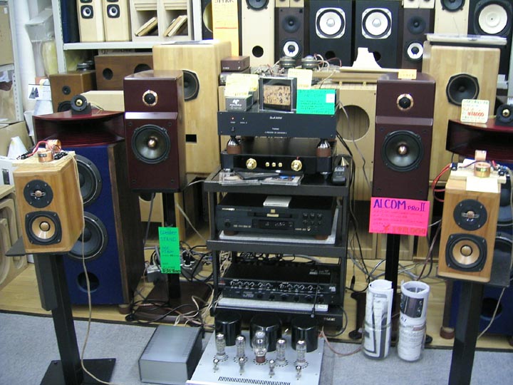 コイズミ無線本店の奥にある試聴エリア。ビクターの手作りスピーカーキットが試聴可能。中程に設置しているコイズミ無線オリジナルスピーカーALCOM PROMk2は完成品ペア198000円。キットだと16万円弱。このスピーカー、アルパインのカーオーディオ用ユニットを搭載したこのスピーカー、けっこういい音してます。