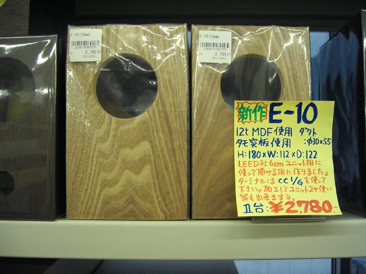 6cm口径前後の小型ユニットに好適なエンクロジュアE-10が入荷。値段が安く、造りは良さそうで、ツキ板仕上げで外見もまずまず。デスクトップ用のニアフィールドスピーカーの制作にうってつけのエンクロージュアかも。